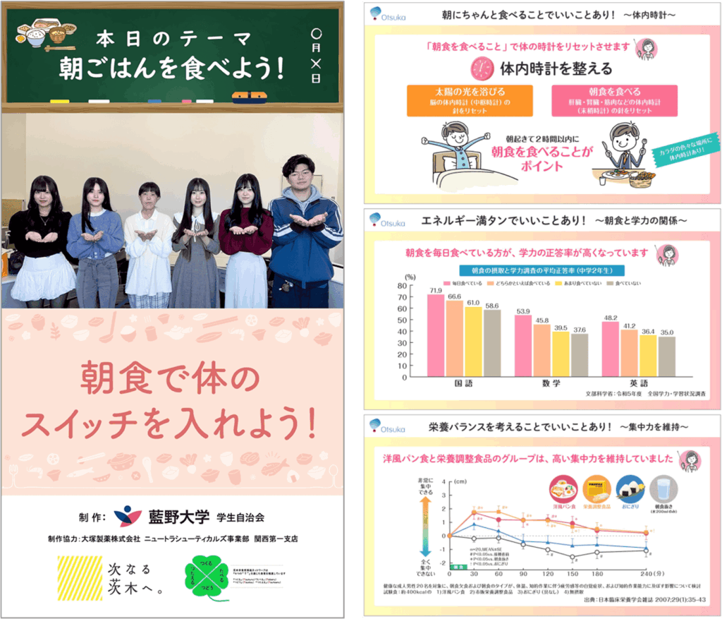 そこで、学校法人藍野大学(大阪府茨木市、理事長 山本 嘉人)では、茨木市(大阪府茨木市、市長 福岡 洋一)及び大塚製薬株式会社ニュートラシューティカルズ事業部関西第一支店(大阪市北区、支店長 田中 健太郎)との連携により、茨木市民の朝食欠食改善に向けた啓発動画を制作しました。 啓発動画は、藍野大学学生自治会が制作したもので、今後、学内でサイネージでの配信や、新入生のオリエンテーションやオープンキャンパスなどでの活用を行うほか、茨木市内の公共施設等での周知・啓発にも使用される予定です。